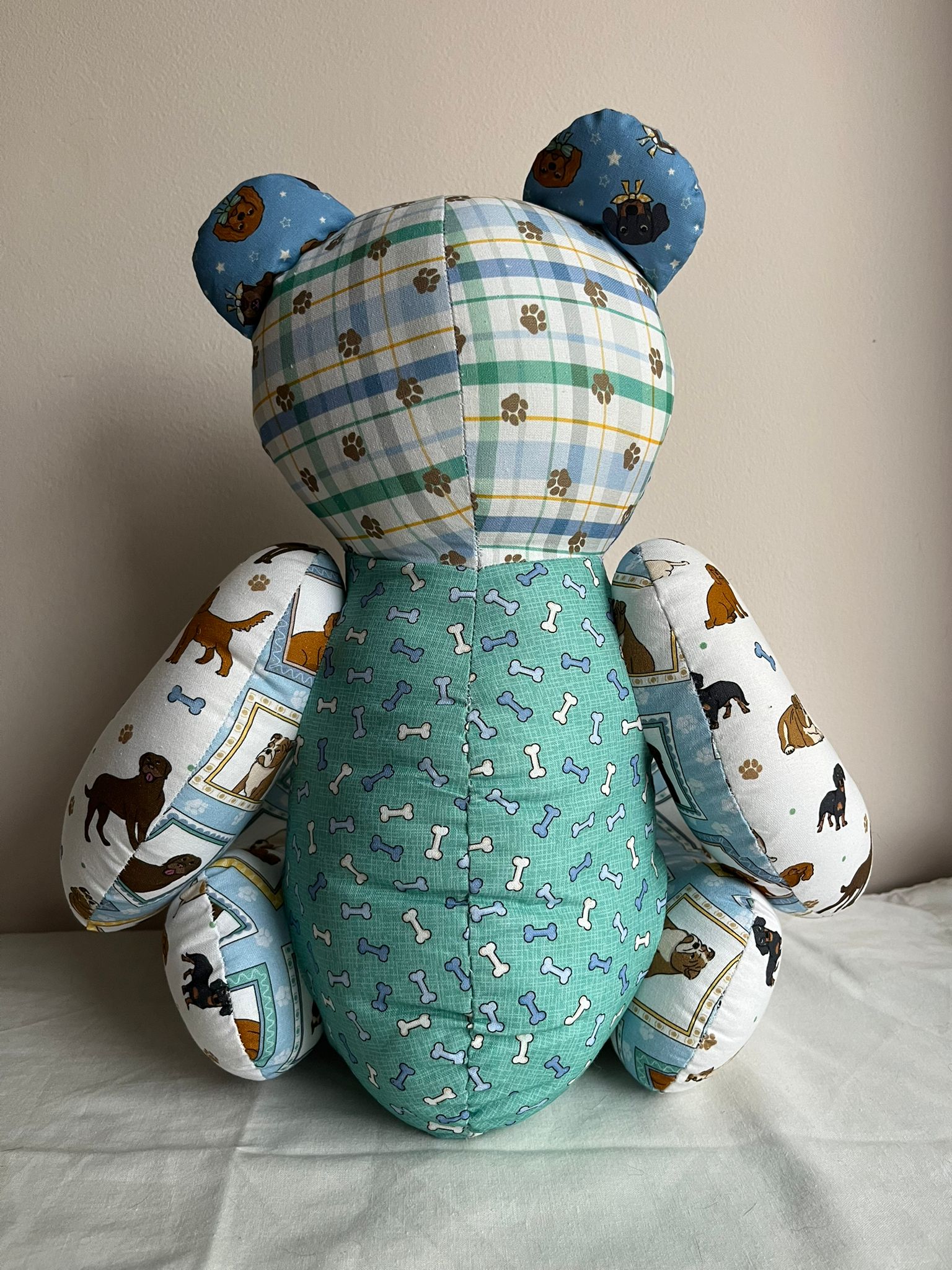Lovingly handmade and completely one of a kind, each Barking Billy will have slight variations in fabric placement — making your bear truly unique.