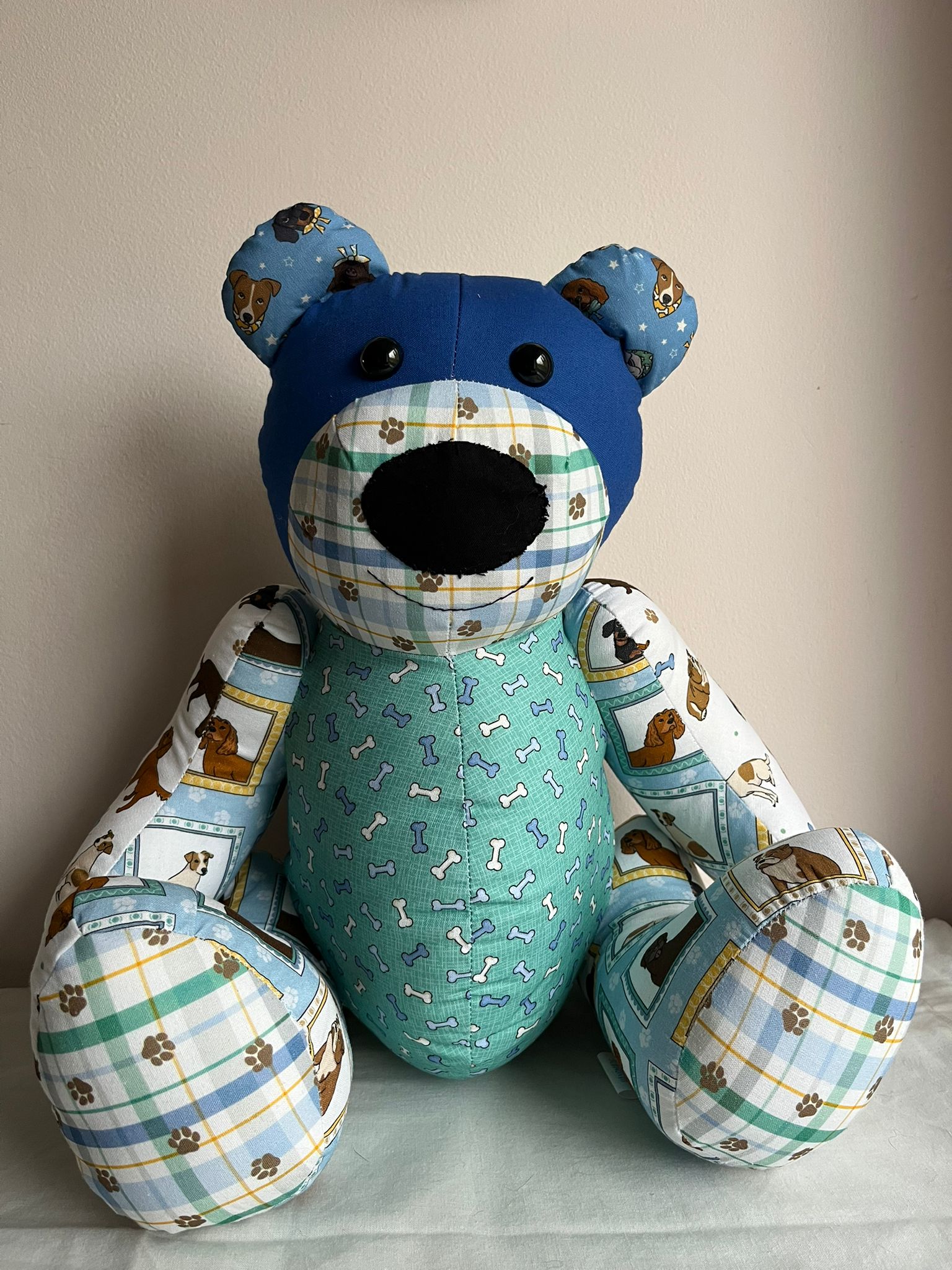Say hello to Barking Billy — the paw-fect companion for dog lovers everywhere! Full of playful charm, this handcrafted bear features delightful dog-themed fabrics, celebrating our four-legged friends in a fun and characterful way.