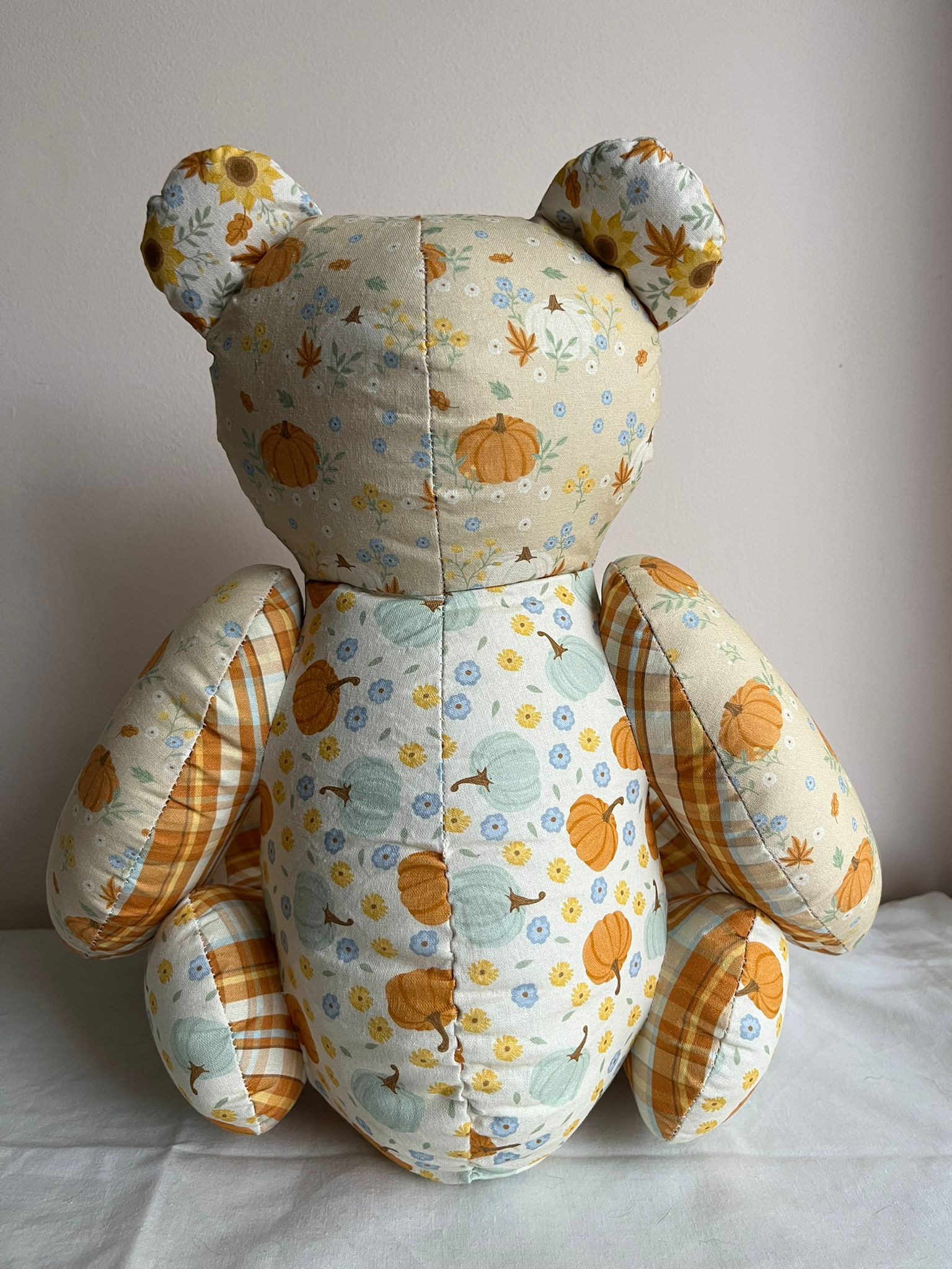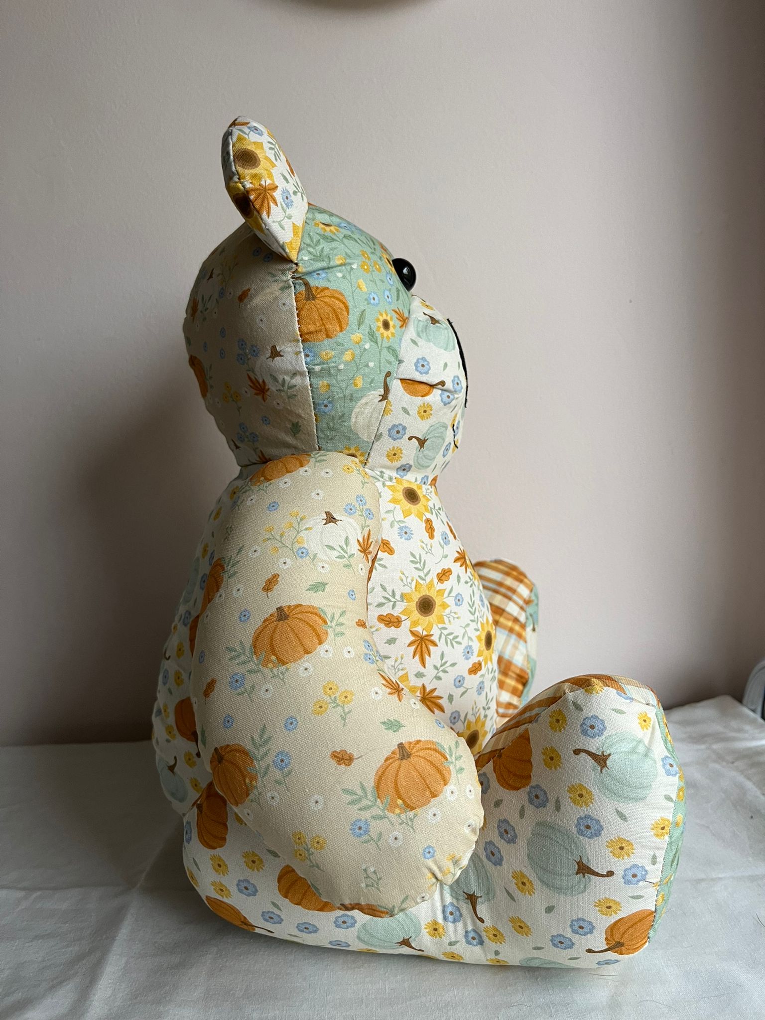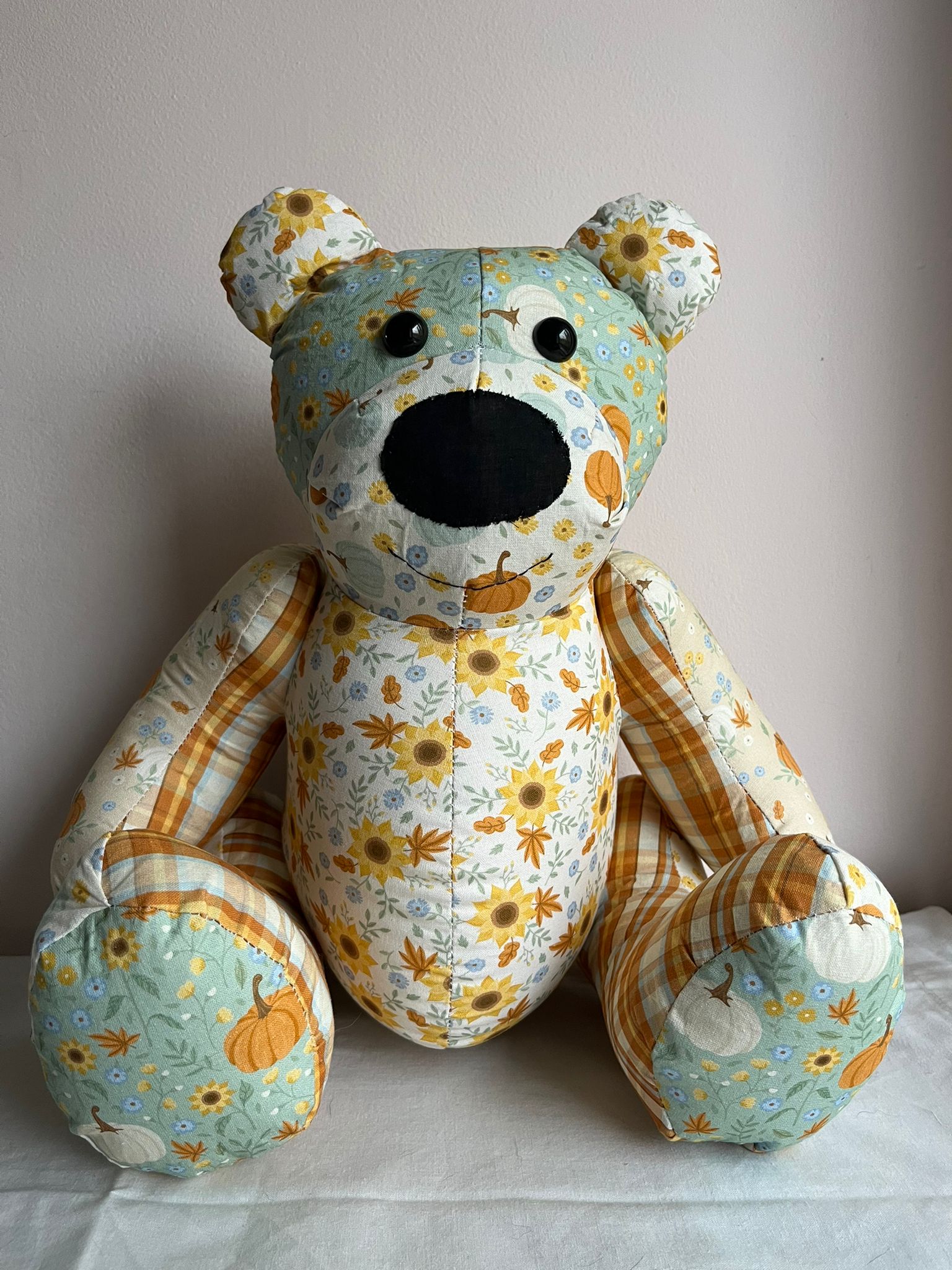 Say hello to Pumpkin Spiced Billy — the cosiest bear of the season! Inspired by golden leaves, crisp countryside walks, and everything autumn, Billy is lovingly handcrafted using beautifully coordinated pumpkin, sunflower, and floral fabrics in soothing sage, warm amber, and soft cream tones.